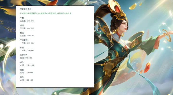 如上图所示,策划是对部分英雄的耗蓝也进行了一番优化,像妲己、扁鹊等相对频繁释放3技能且吃蓝的英雄,这次是下降了20点,也相当于一波小加强了,变相增加了回蓝装成型前的持续作战能力。