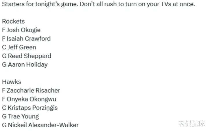 今天比赛,首发阵容方面,火箭队这边,季前赛收官之战杜兰特、申京、小史密斯等主力球员均缺战,乌度卡排出的最新首发五人组为:奥科吉、克劳福德、杰夫-格林、谢泼德、霍勒迪;老鹰队这边则是全主力上阵,首发阵容为:里萨谢、奥孔古、波神、特雷-杨、亚历山大-沃克。