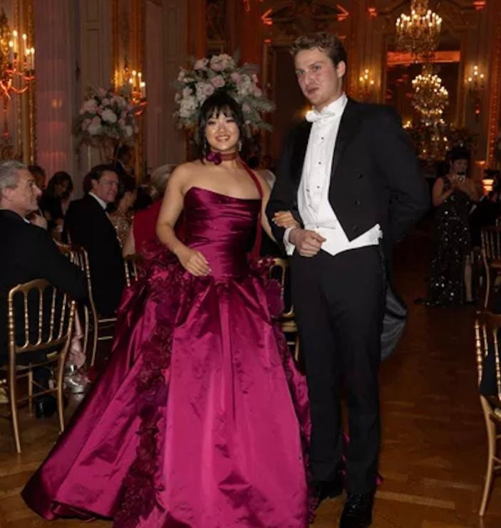 除了贵族之女,Alice Wang也让人不容忽视,她是富家女,一袭枣红色礼服裙站在名媛舞会大合照中的第一排,也是大合照中的亮点之一。
