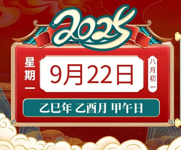 2025年9月22日,星期一,农历八月初一 (乙巳年乙酉月甲午日),法定工作日。