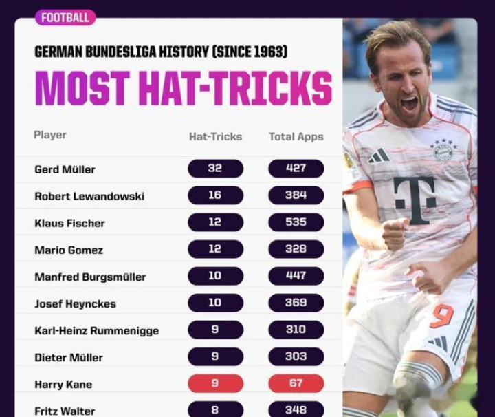 周六的帽子戏法是他在短短67场德甲比赛中的第9次戴帽。德甲历史上仅有6名球员的帽子戏法次数超过他,而这些球员都至少出战了328场比赛。