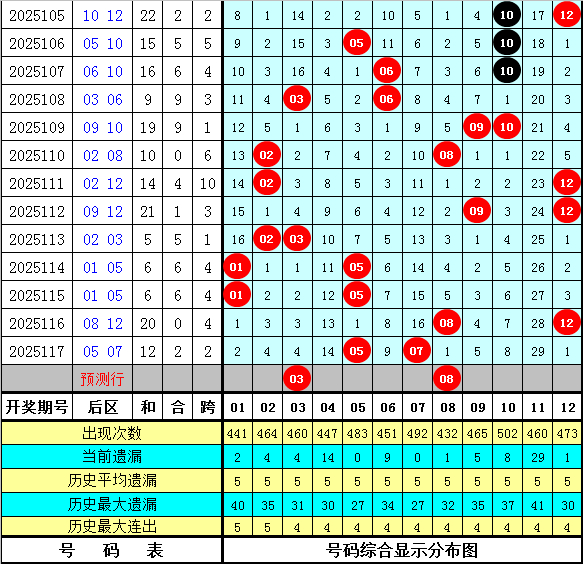和值跨度:上期和值开出83,对比第2025116期和值上升了8个点位,本期预计和值在大号区域热出,看好出现在103周围。