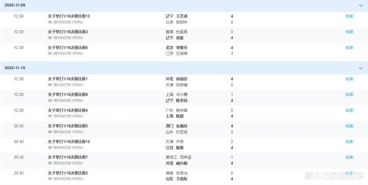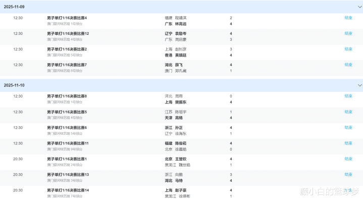 在看男单,五号种子向鹏已经出局,六号种子陈垣宇已经出局,7号种子周启豪已经出局,13号种子徐海东已经出局,14号种子徐瑛彬已经出局。