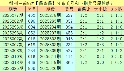 上期回顾:排列三第2025325期开出奖号836,类型为:偶奇偶、200路和大小大。