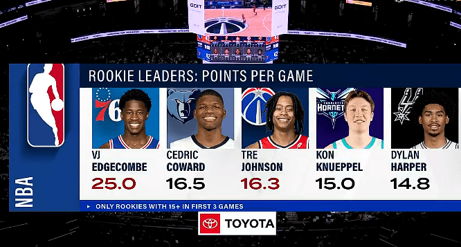 比赛的第二节,转播画面给出了一组数据,内容为2025届新秀本赛季至今的场均得分榜前五名,详情如下(注:至少出战本赛季三场比赛)。