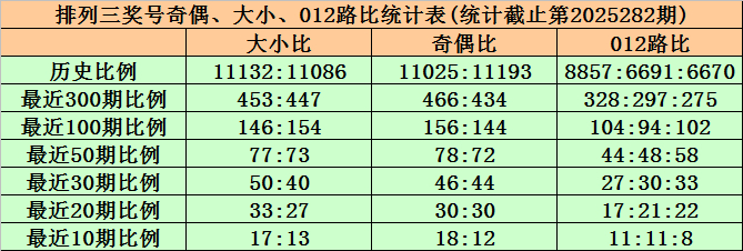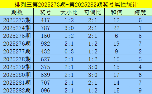 上期回顾:排列三第2025282期出现奖号096。开出组六,奇偶比1:2,012路比3:0:0,大小比2:1,和值15,跨度9。